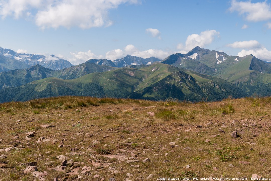 2. Пик Пришвина с севера. Июнь. 3. Вершина горы Цахвоа с одноименным ледником. Август. 4. Старый солонец на Джуге. На заднем плане массив Уруштен. Август. 5. Река Цахвоа. Октябрь. 6. Гора Чугуш с востока. Июнь. 7. Палатка наблюдателей на хребте Пшекиш. На заднем плане, слева направо - Джемарук, Тыбга, Безводный хребет, массив Атамажи-Абаго. Февраль. Карта.