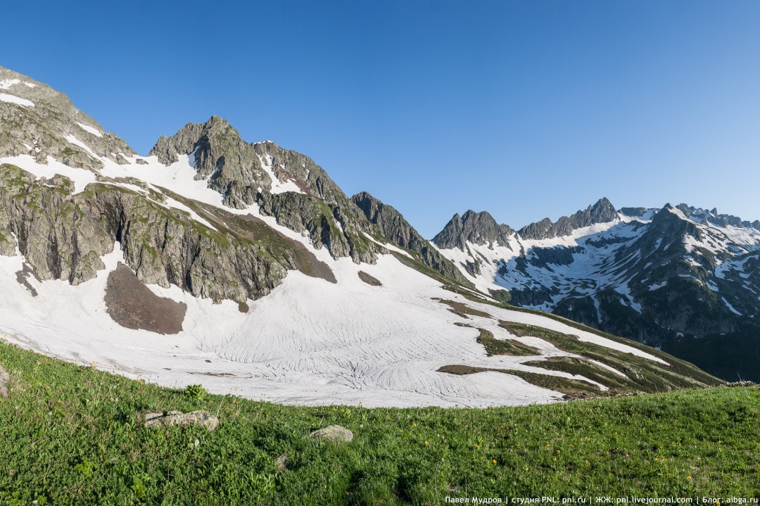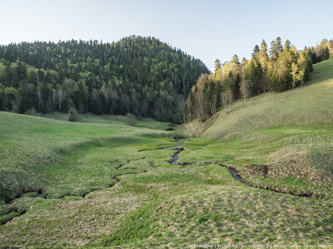 2. Вид на Фишт и Оштен с лагеря Горский Табор. Май. 3. Река Цахвоа впадает в Малую Лабу, разливаясь по лесу. Сентябрь. 4. Водораздел Киши и Китайки. Июнь. 5. Гребень Малого Чугуша спускается в долину реки Березовая. Июнь. 6. Один из рукавов реки Цахвоа в её среднем течении. Октябрь. 7. В западном цирке горы Воробьева. Июль. Карта.